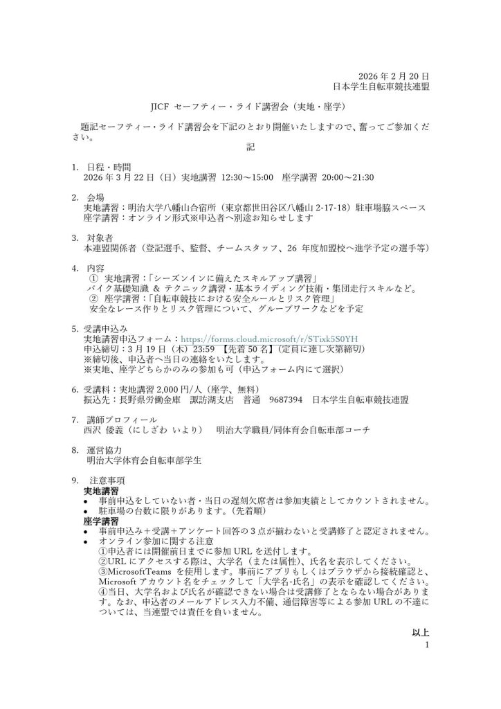 JICF セーフティライド「シーズンインに備えたスキルアップ講習」 JICF セーフティライド 「シーズンインに備えたスキルアップ講習」 締切:2026年3月19日 申し込みフォーム : こちらから ダウンロードデータ 2026/02/25:実施要項(PDF)