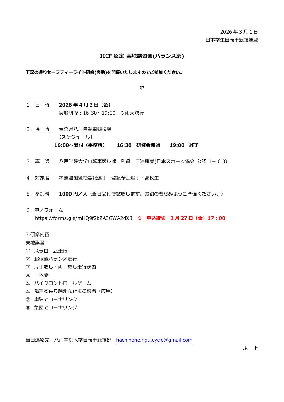 JICF認定セーフティ・ライド実地研修会(バランス系)@八戸自転車競技場