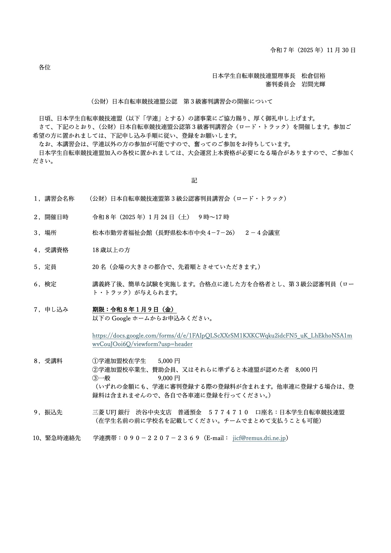 受講期日:各レースのエントリー期限日(インカレ:2025/7/28) 2025/07/25:受講修了者名簿(7/28時点WEBテスト合格者)(PDF) ※7/29更新 2025/07/07:受講申し込みフォーム(Google) 2025/07/07:マディソン座学講習(e-ラーニング)要項(PDF)