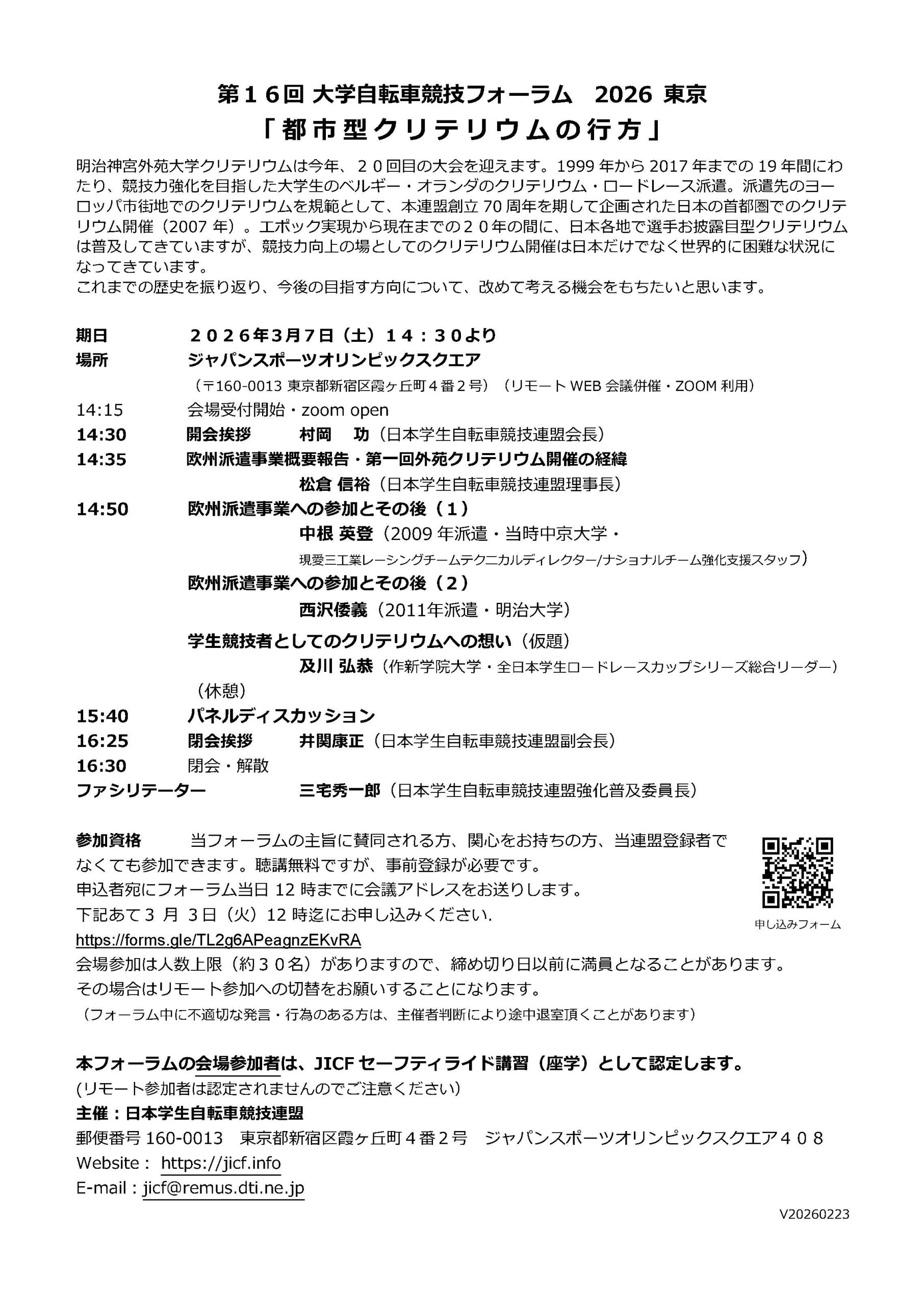 エントリー締切:01/27 (支払期限02/03) ダウンロードデータ 2026/02/27:コミュニケ10 ドーピングコントロール (PDF) 2026/02/27:コミュニケ9 応援団スペース (PDF) 2026/02/27:コミュニケ8 テント配置見取図 (PDF) 2026/02/27:コミュニケ7 コース上の走行注意区間 (PDF) 2026/02/27:コミュニケ6 競技系注意事項 (PDF) 2026/02/27:コミュニケ5 総務系注意事項(立哨・競技役員向け) (PDF) 2026/02/27:コミュニケ4 総務系注意事項(選手・チーム向け) (PDF) 2026/02/27:コミュニケ3 コース図 (PDF) 2026/02/27:コミュニケ2 時程表 (PDF) 2026/02/14:受付者一覧について(PDF) 2026/02/05:応援団について(PDF) 2026/02/01:コミュニケ1 エントリー料金振込に関して (PDF) ※2/27更新 2026/01/21:セーフティ・ライド研修受講ポイント等(PDF) ※01/22更新 2026/01/12:一般参加者用エントリーシート(Excel) 2026/01/12:学連選手用エントリーシート(Excel) 2025/12/17:大会要項(PDF) ※02/17更新