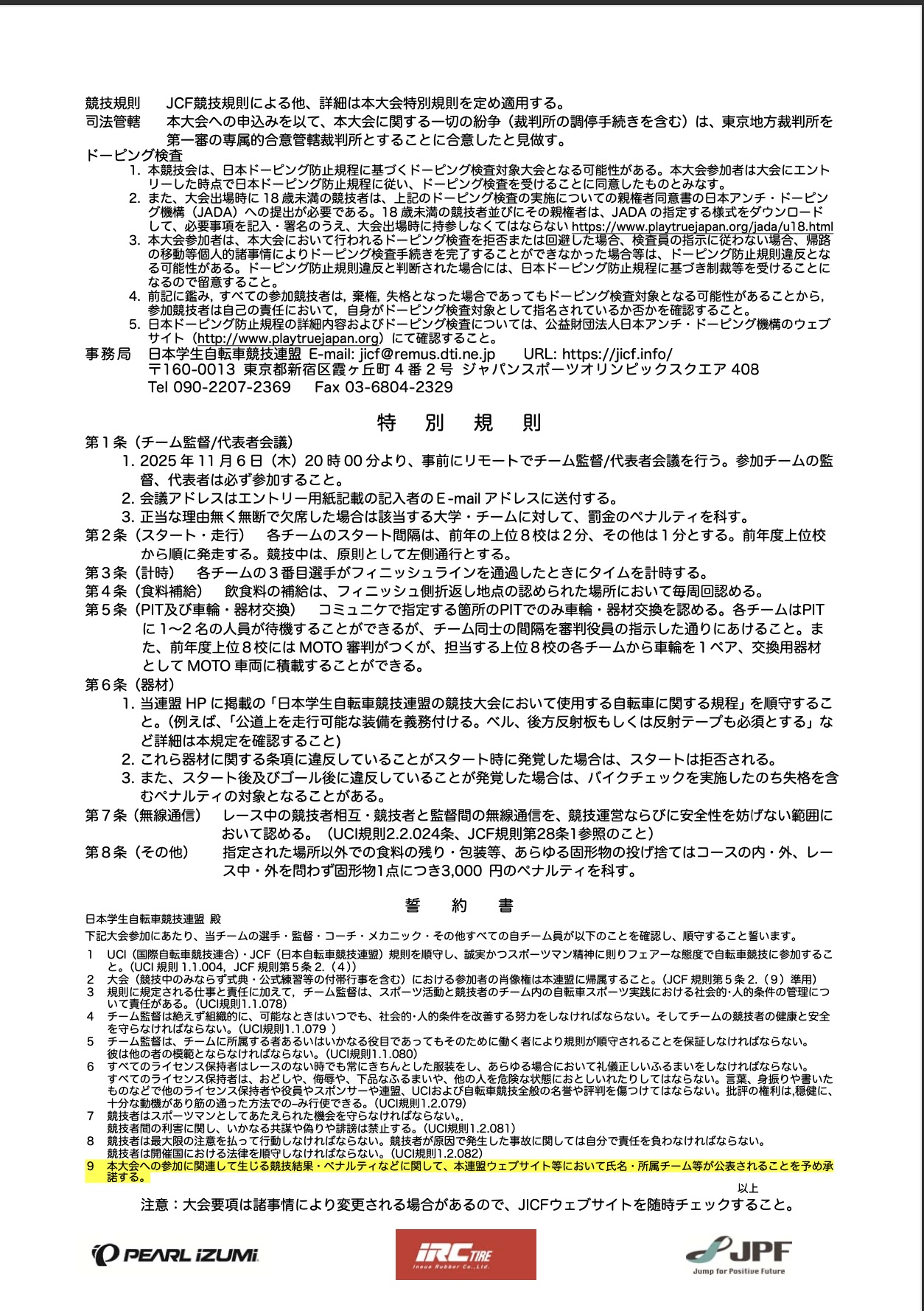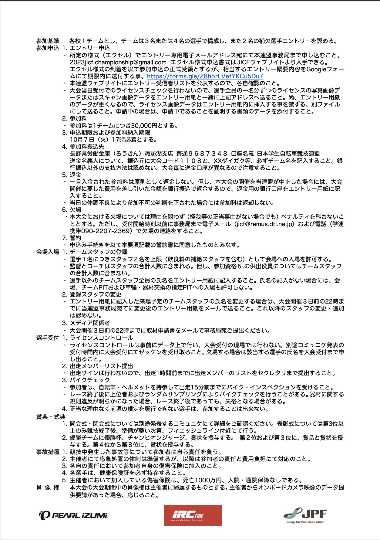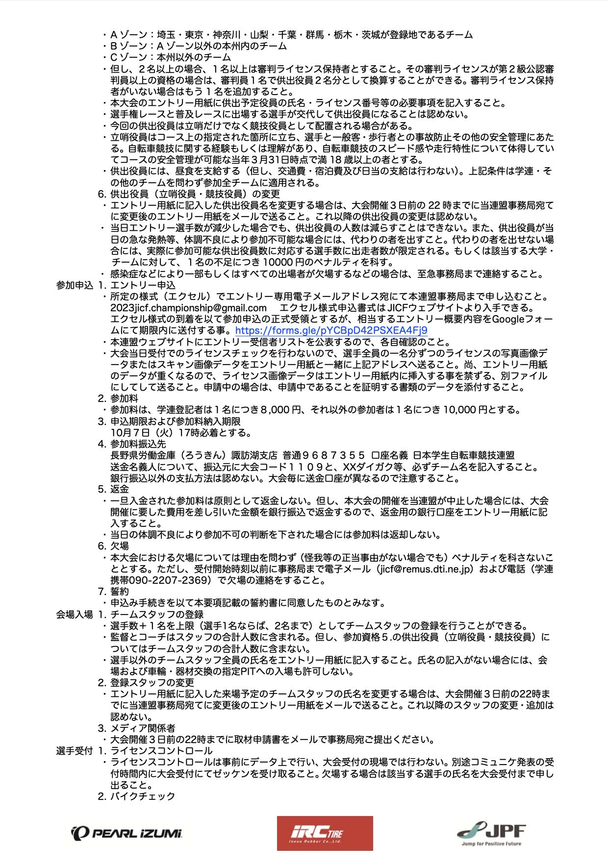 Download data Youtubeアーカイブリンク:一日目 二日目 2023/11/26:Complete Communiqué (PDF) 2023/11/24:学連連絡(ペナルティ)(PDF)※ for JICF only 2023/09/23:Entry Form by Number(WORD) 2023/09/23:Enlorement entry form (EXCEL) 2023/09/23:About JICF team entry(PDF) 2023/08/29:TechnicalGuide(PDF)※11/24修正 Revised