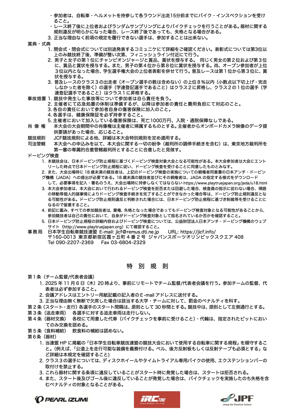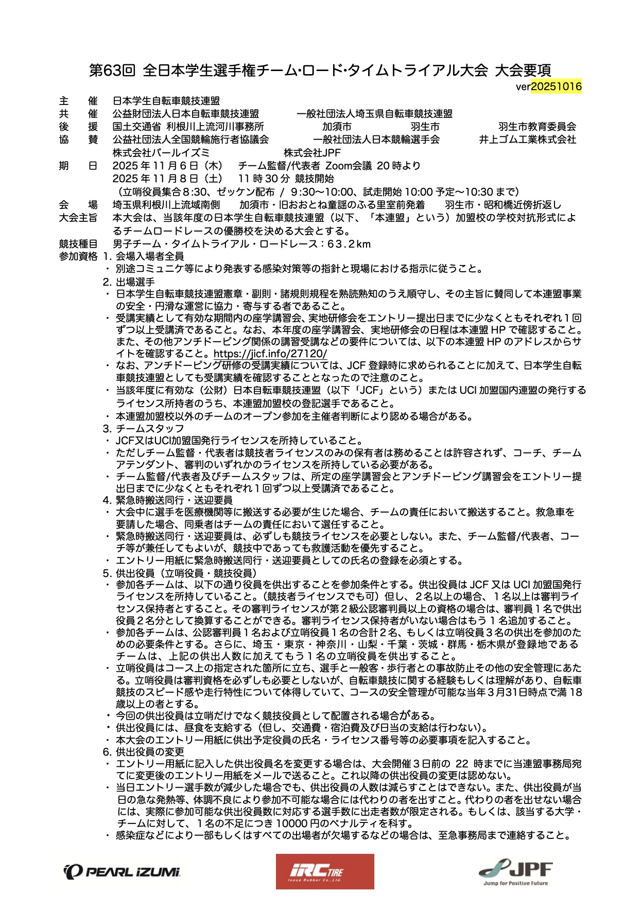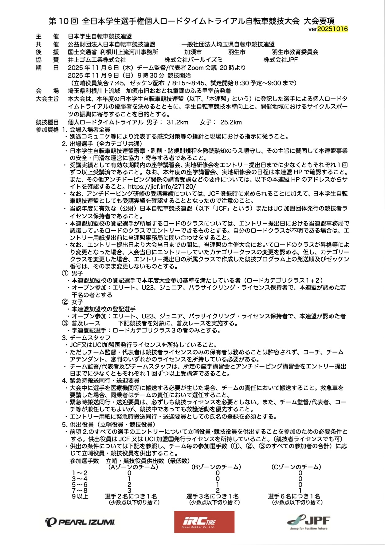 ダウンロードデータ 申込締切:2025/10/07 2025/10/08:エントリー受信者一覧兼セーフティ・ライド研修等受講状況一覧(PDF)※ 10/11更新 2025/09/29:エントリーシート(Excel) 2025/08/25:大会要項(PDF)※10/17更新