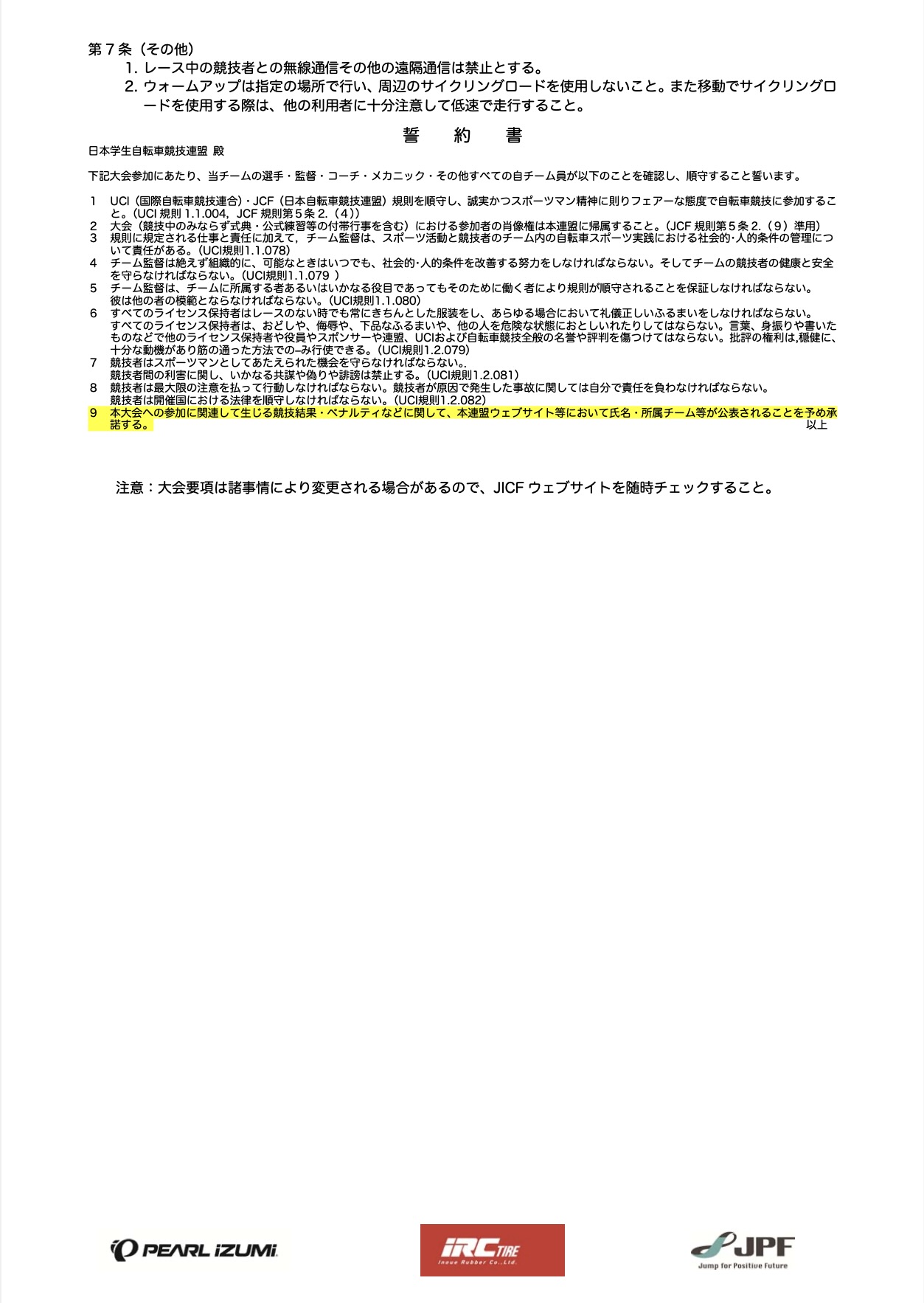 Download data 07/17/2019:Result(Revised)(PDF) 07/13/2019:Communique6(REIVISED)(PDF) 07/13/2019:Communique5(About Technical Officials)(PDF) 07/11/2019:Communiue4(PDF) 07/10/2019:Communique3(Time Schedule)(PDF) 07/10/2019:Communique2(Entrylist:Latest Edition)(PDF) 07/04/2019:Communique1(PDF) 06/28/2019:Entrylist(Registered players enrolled in JICF only) 06/09/2019:Entry by Name(modified)(Excel) 06/09/2019:Entry by Number(modified)(Excel) 06/09/2019:TechnicalGuide(modified)(PDF) 06/01/2019:学連選手用エントリー用紙(Application form ONLY for registered players enrolled in the Japan Intercollegeate cycling federation)(Excel) 06/01/2019:学連選手向け要項(ONLY for registered players enrolled in the Japan Intercollegeate cycling federation )(PDF)